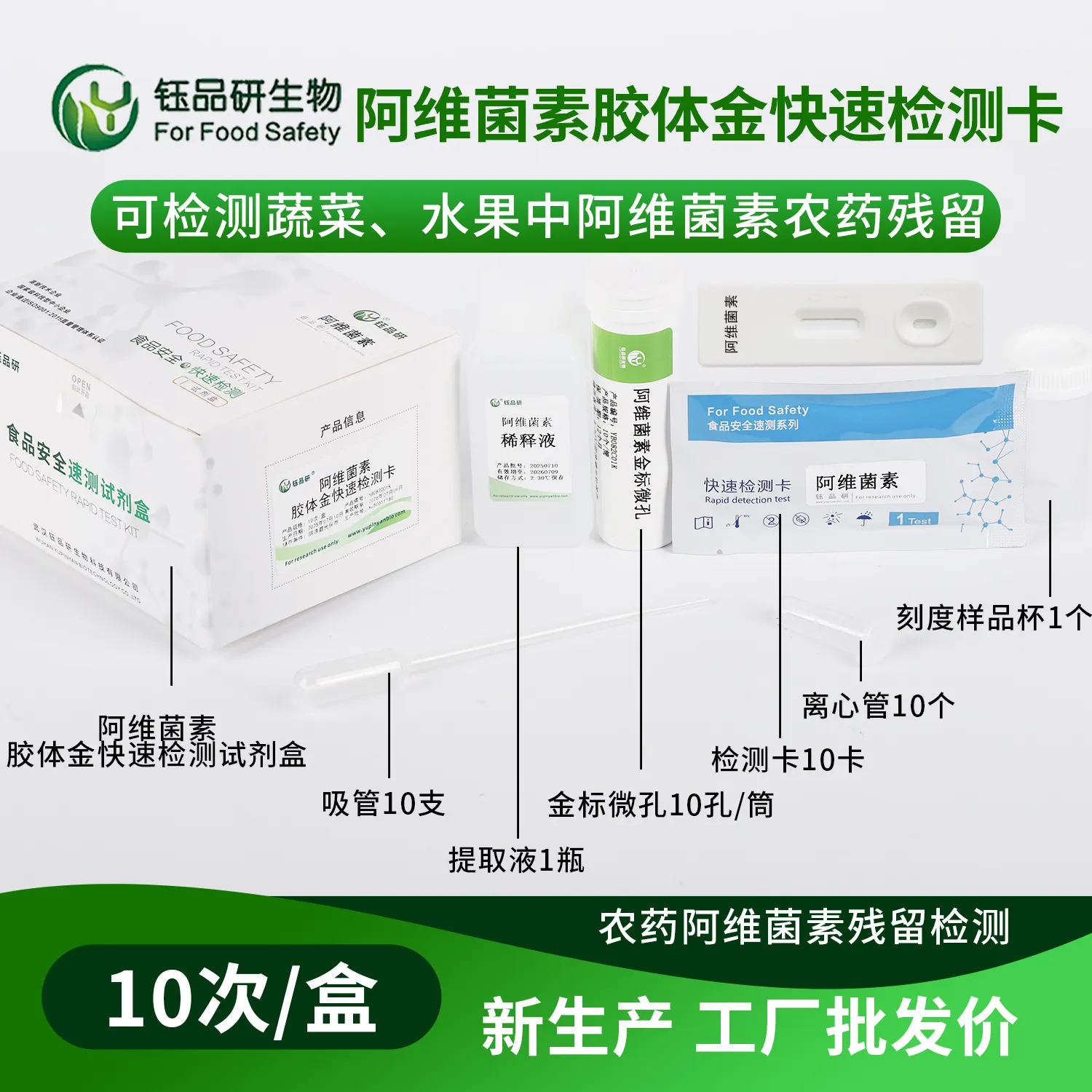 武汉钰品研生物噻虫胺胶体金快检卡,基于竞争抑制免疫层析技术。检测微孔内冻干金标抗体,硝酸纤维素膜检测线(T 线)包被噻虫胺抗原,对照线(C 线)包被羊抗鼠 IgG 二抗。样本中的噻虫胺与金标抗体结合,抑制其与 T 线抗原结合,借 T 线颜色变化,10 分钟内判断残留。操作简便,处理蔬菜、水果、粮食等样本后滴加试剂即可,无需专业设备。噻虫胺作为杀虫剂,若在食品中残留超标,长期摄入可能引发人体头痛、头昏、恶心呕吐等症状。我国对其在食品中的残留量严格管控。适用于种植、加工企业自检及监管抽检。咨询 13720286360,守护食品安全。...