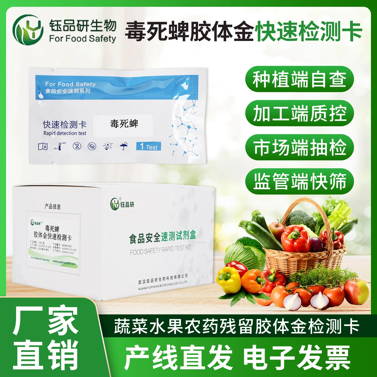 武汉钰品研生物毒死蜱胶体金快检卡,基于竞争抑制免疫层析技术。检测微孔内冻干金标抗体,硝酸纤维素膜检测线(T 线)包被毒死蜱抗原,对照线(C 线)包被羊抗鼠 IgG 二抗。样本中的毒死蜱与金标抗体结合,抑制其与 T 线抗原结合,借 T 线颜色 10 分钟内判断残留。操作简便,处理蔬菜、水果、粮食等样本后滴加试剂即可,无需专业设备。毒死蜱作为有机磷杀虫剂,若在食品中残留超标,会抑制胆碱酯酶活性,影响神经系统功能,长期摄入可致头痛、头晕、恶心呕吐、肌肉震颤等症状,危害健康。我国对其在食品中的残留量严格管控。适用于种植、加工企业自检及监管抽检。咨询 13720286360,守护食品安全。...
