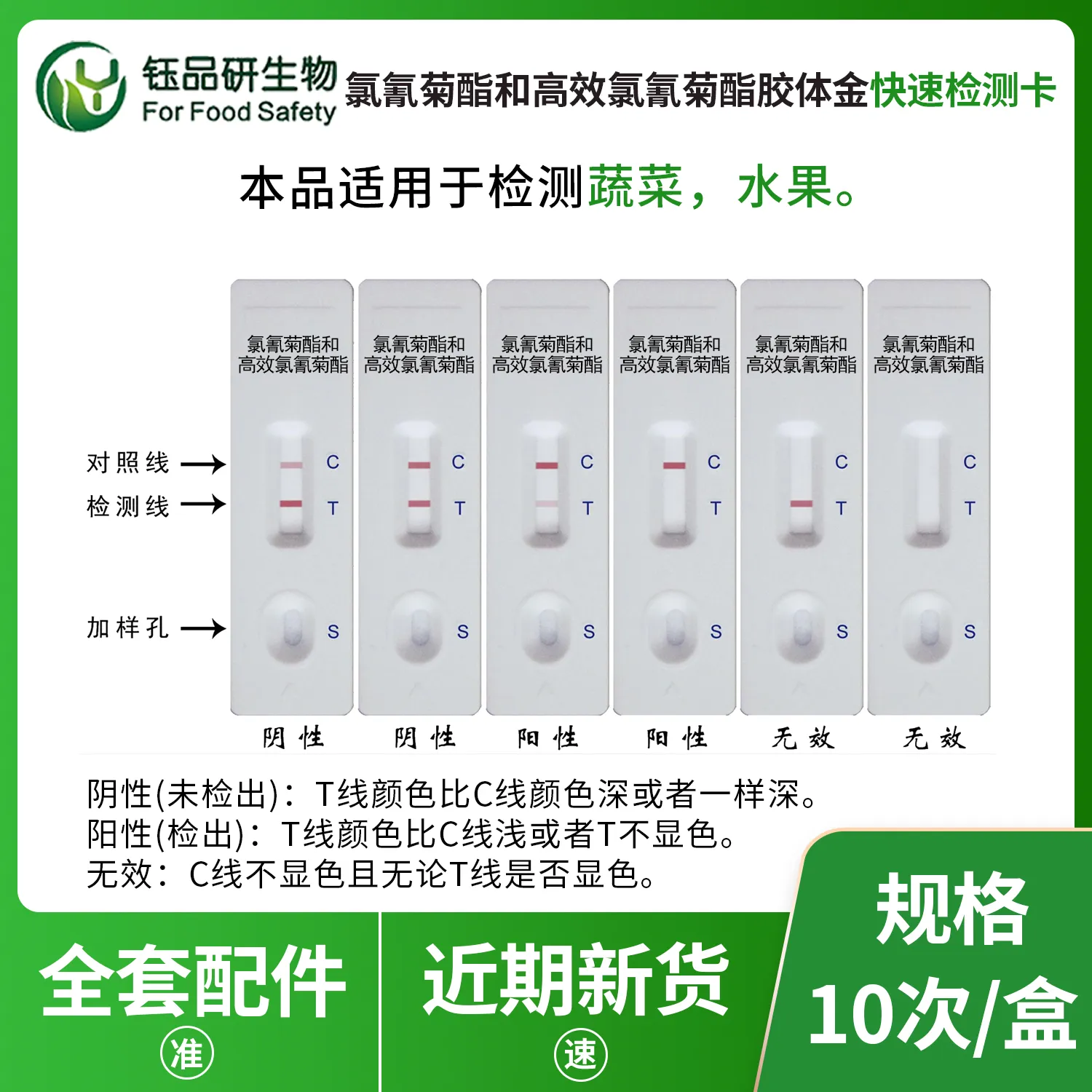 阳性(+):在检测窗内,C线出现紫红色线,T线不显色或比C线浅,表明样本中氯氰菊酯浓度高于检测限。