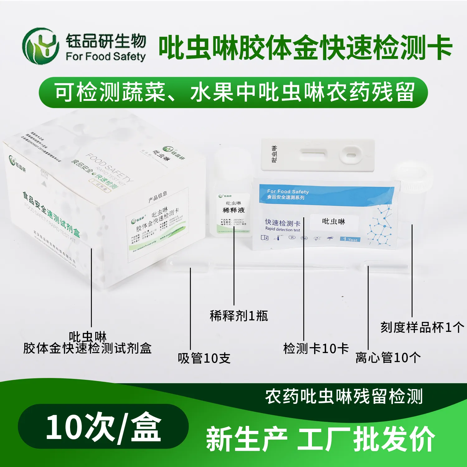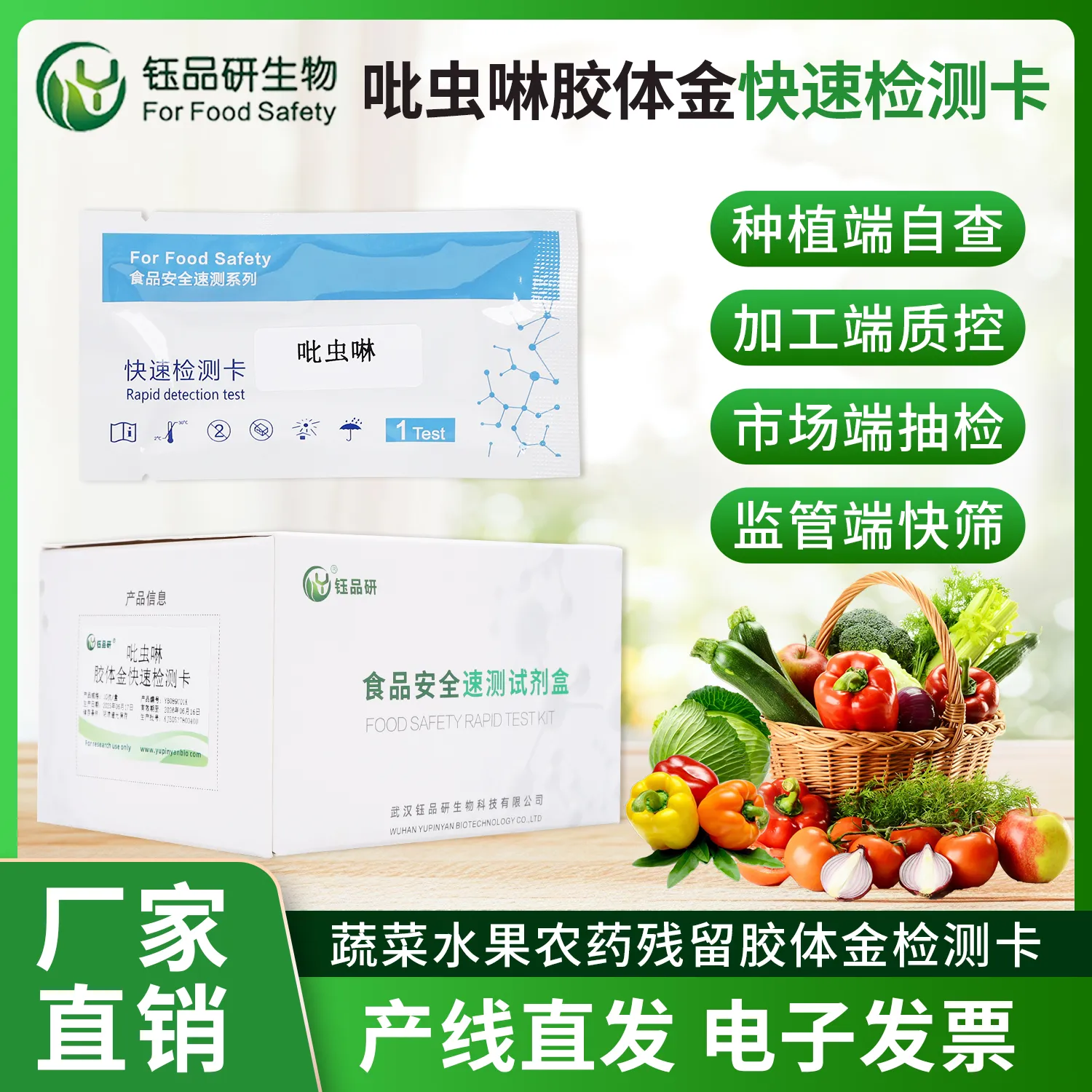 武汉钰品研生物吡虫啉胶体金快检卡,基于竞争抑制免疫层析技术。检测微孔预冻干金标抗体,硝酸纤维素膜检测线(T 线)包被吡虫啉抗原,对照线(C 线)包被羊抗鼠 IgG 二抗。样本中吡虫啉与金标抗体结合,抑制其与 T 线抗原结合,10 分钟内借 T 线颜色判断残留。操作简便,按说明处理蔬果样本后滴加试剂即可,无需专业设备。吡虫啉作为烟碱类杀虫剂,虽高效低毒,但残留超标仍可能刺激皮肤、黏膜,引发胃肠道不适,长期接触或影响神经系统。适用于种植、加工企业自检及监管抽检。咨询 13720286360,守护食品安全。...