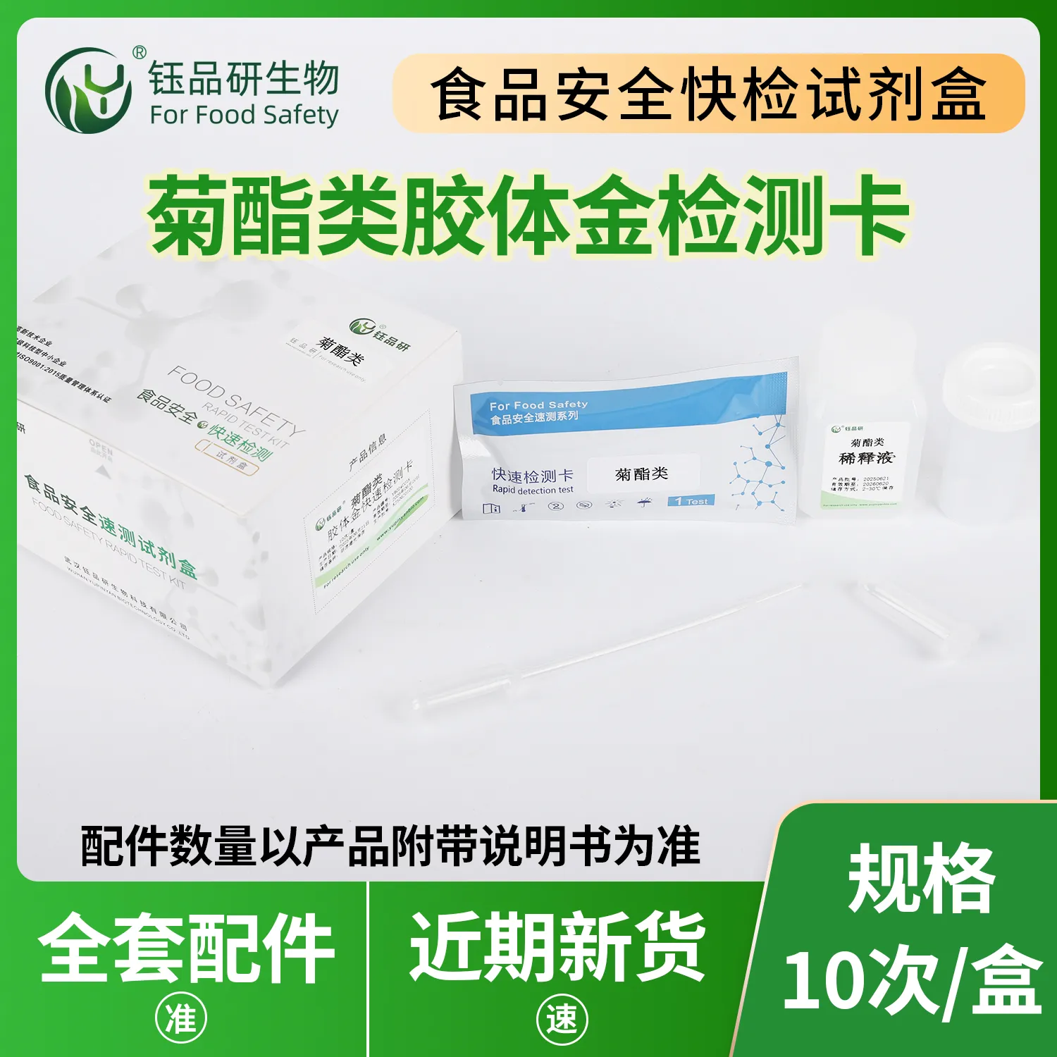 菊酯类胶体金快检卡,基于竞争抑制免疫层析技术。检测微孔预冻干金标抗体,硝酸纤维素膜 T 线包被菊酯类抗原,C 线包被羊抗鼠 IgG 二抗。样本中菊酯类与金标抗体结合,抑制其与 T 线抗原结合,10 分钟内借 T 线颜色判断残留。操作简便,按说明处理蔬果、肉类等样本后滴加试剂即可,无需专业设备。菊酯类残留超标,会刺激皮肤、黏膜,影响神经,危害健康。适用于种植、加工企业自检及监管抽检。咨询 13720286360,武汉钰品研生物。...