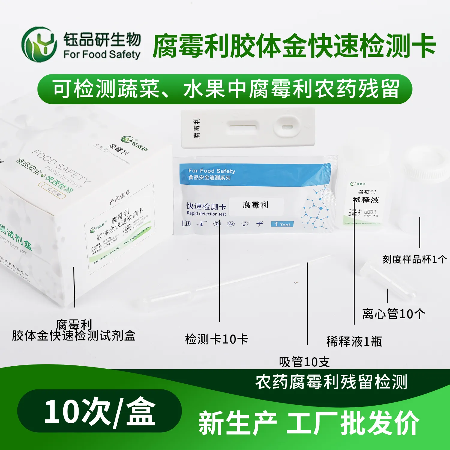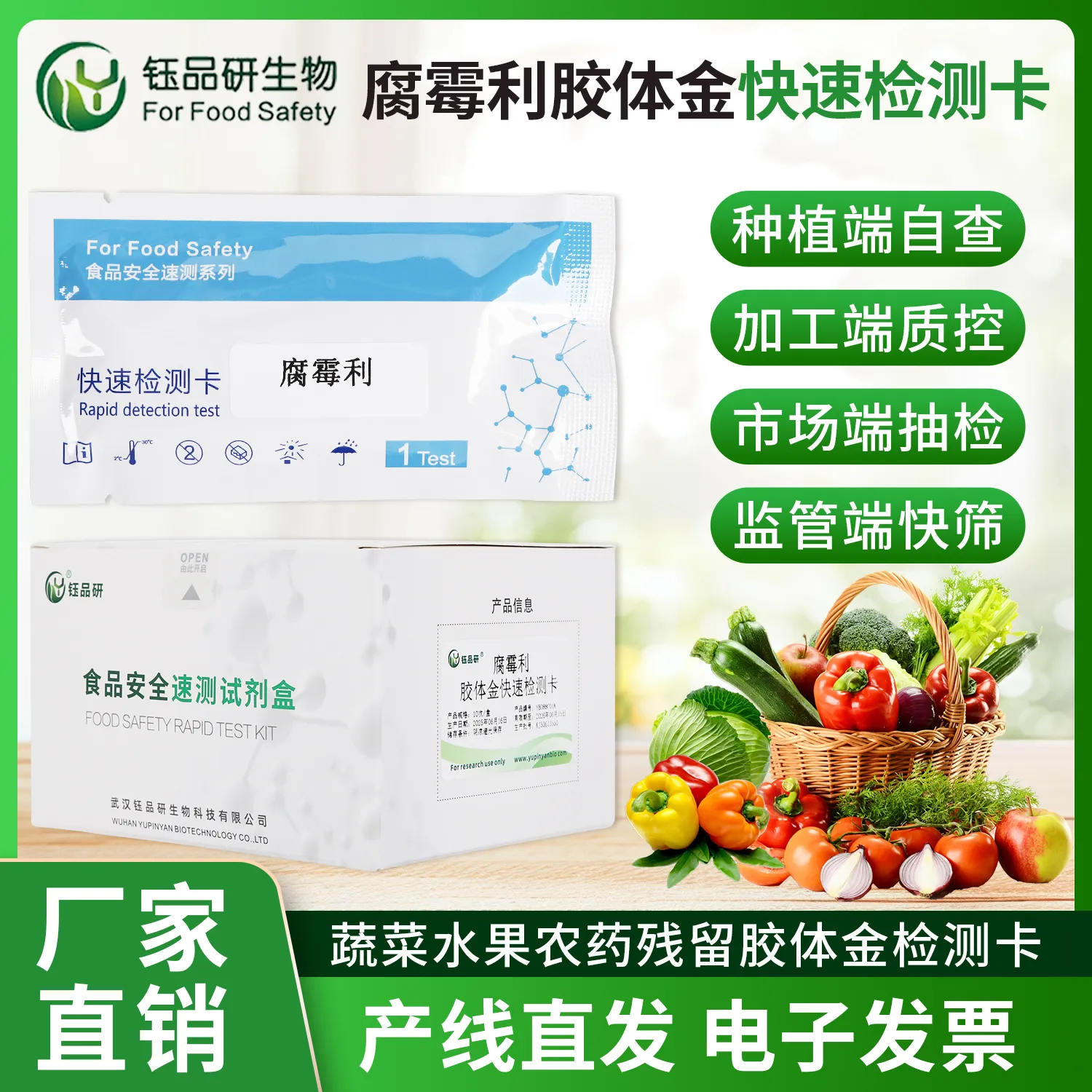 武汉钰品研生物腐霉利胶体金快检卡,基于竞争抑制免疫层析技术。检测微孔预冻干金标抗体,硝酸纤维素膜检测线(T 线)包被腐霉利抗原,对照线(C 线)包被羊抗鼠 IgG 二抗。样本中腐霉利与金标抗体结合,抑制其与 T 线抗原结合,10 分钟内借 T 线颜色判断残留。操作简便,按说明处理蔬果样本后滴加试剂即可,无需专业设备。腐霉利是低毒杀菌剂,残留超标可能刺激人体眼、皮肤,长期摄入或影响神经、血液系统。适用于种植、加工企业自检及监管抽检。咨询 13720286360,守护食品安全。...