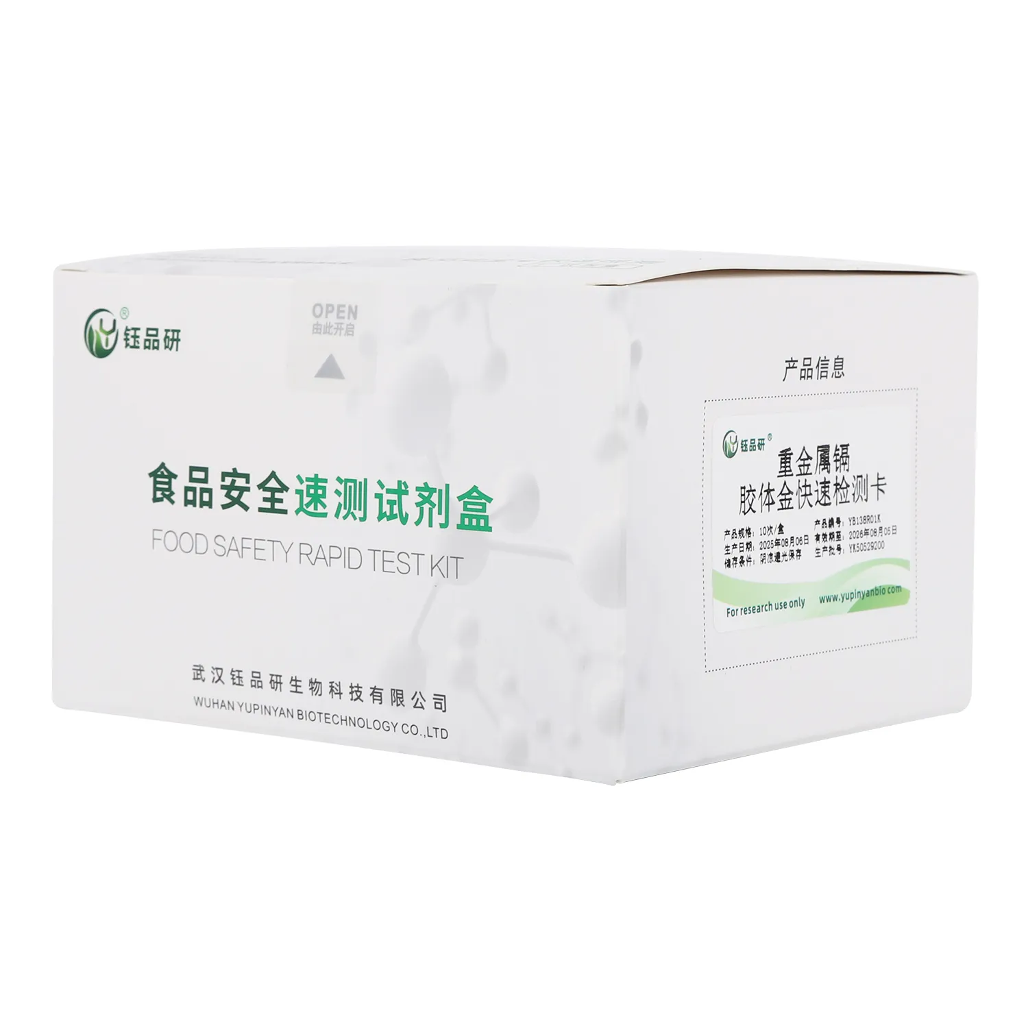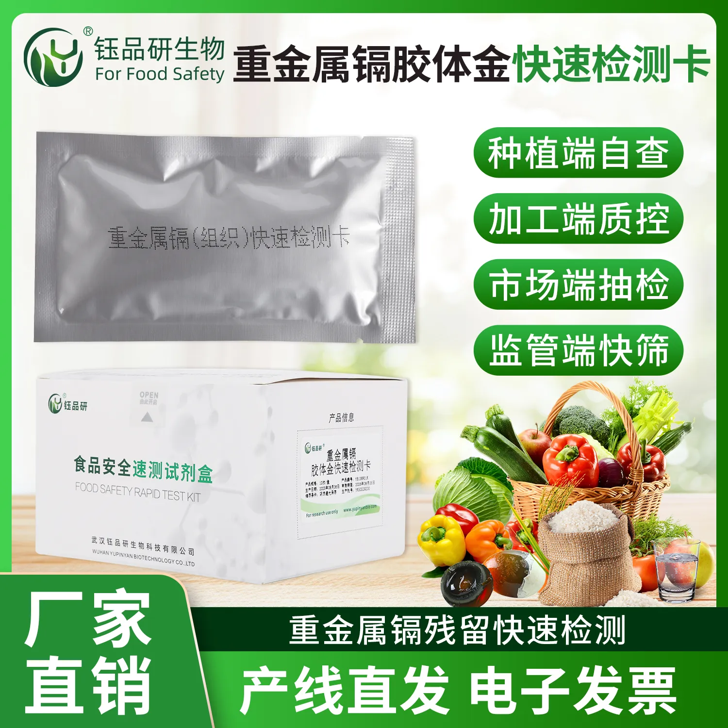 武汉钰品研生物重金属镉胶体金快检卡,基于竞争抑制免疫层析技术,样本中镉离子与胶体金标记抗体结合,抑制其与检测线偶联物结合,借 T 线颜色变化,10 分钟内快速判断残留情况。操作简便,无需专业设备,简单处理样本滴加试剂即可。镉具强毒性,长期摄入会损害肾脏、骨骼,甚至致癌。适用于农产品、水产品、食品加工企业自检、监管抽检等场景。咨询 13720286360,守护饮食安全。...