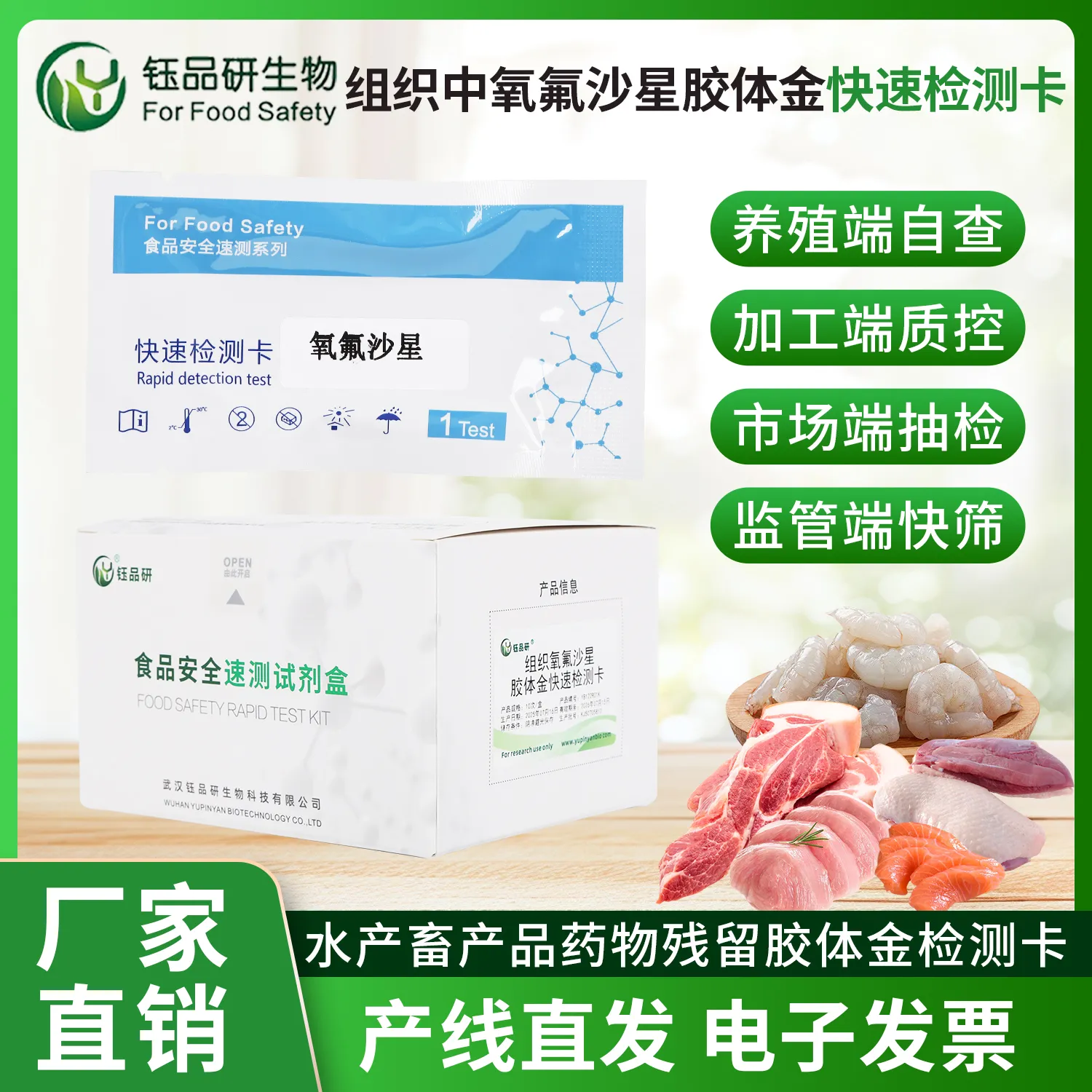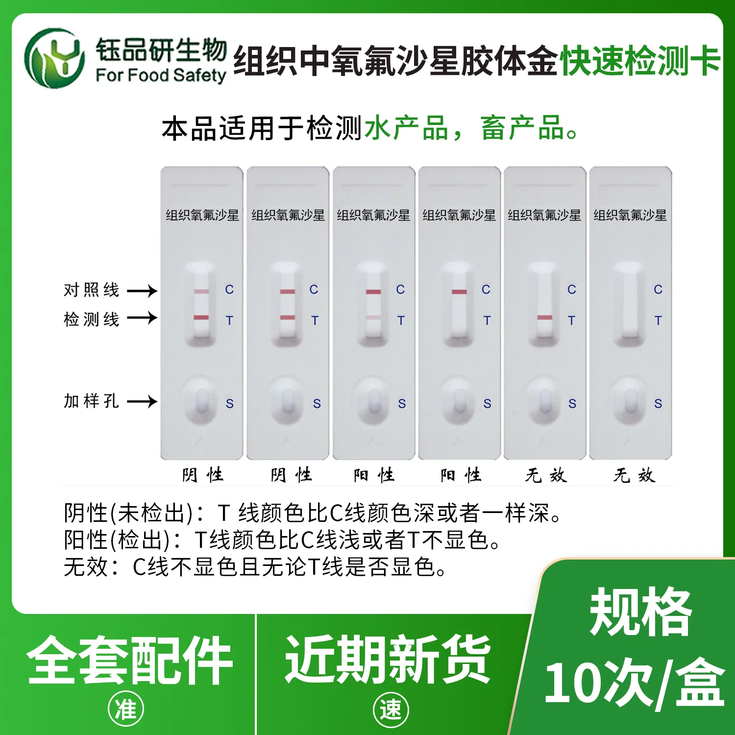 氧氟沙星胶体金快检卡,基于竞争抑制免疫层析原理。检测微孔预冻干金标氧氟沙星抗体,硝酸纤维素膜 T 线包被氧氟沙星抗原,C 线包被羊抗鼠 IgG 二抗。简单处理水产、畜禽肉、禽蛋等样本后滴加试剂,样本中氧氟沙星与金标抗体结合,抑制其与 T 线抗原结合,10 分钟内借 T 线颜色判断残留。氧氟沙星作为广谱抗菌药,滥用致残留超标,会引发人体过敏、肝肾损伤、胃肠不适等。适用于养殖、加工企业自检及监管部门抽检。咨询 13720286360,武汉钰品研生物。...