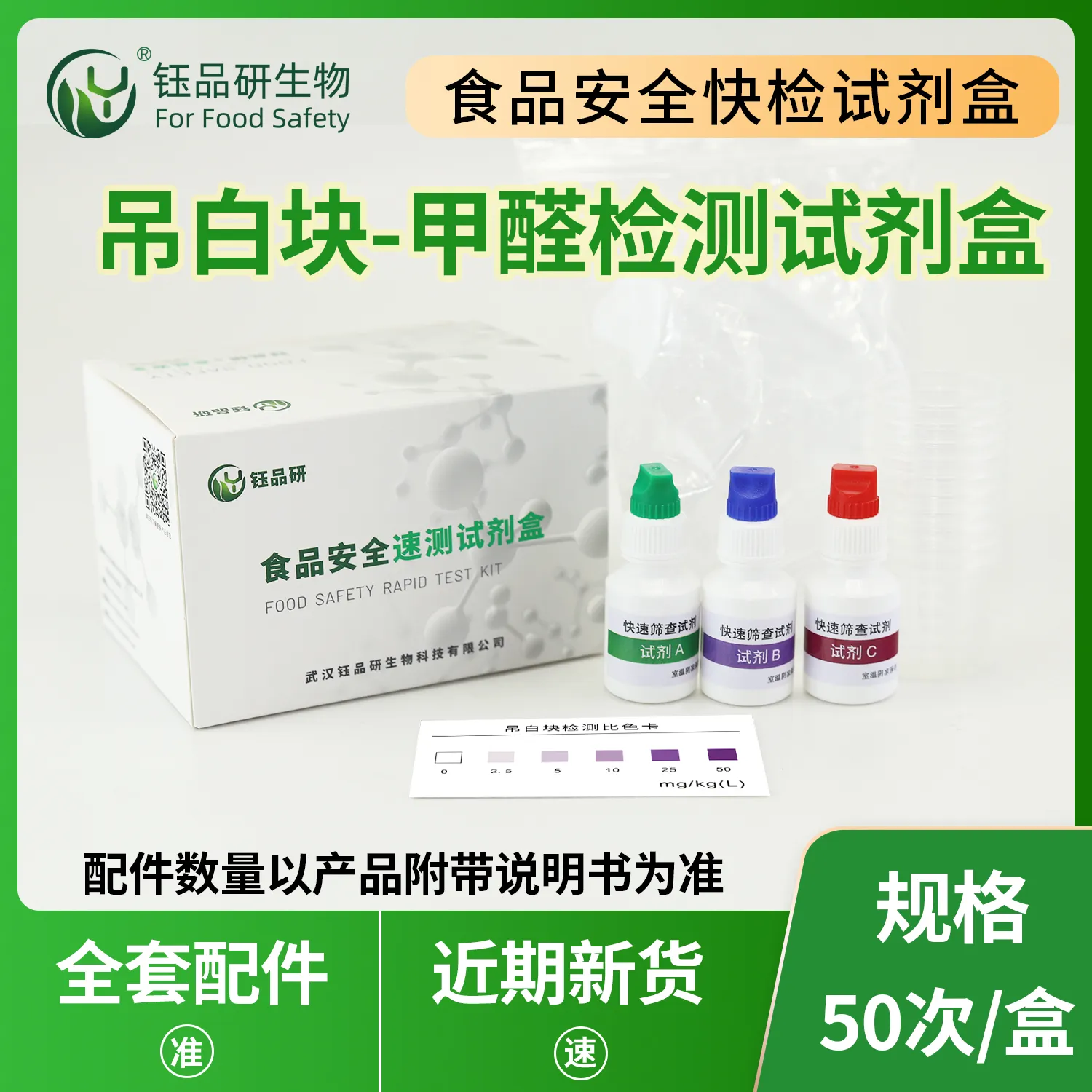 武汉钰品研生物食品中吊白块 - 甲醛速测试剂盒,基于特定化学反应原理,吊白块分解出的甲醛与试剂发生反应,生成特征颜色,依颜色变化 10 分钟内快速判定含量。操作简便,无需专业设备,按说明处理样本、添加试剂即可。吊白块严禁用于食品,其分解产物甲醛严重损害人体呼吸、心血管等系统,有致癌风险。适用于米面制品、豆制品、水发产品等食品企业自检、市场监管抽检、餐饮自查。咨询 13720286360,守护食品消费安全。...