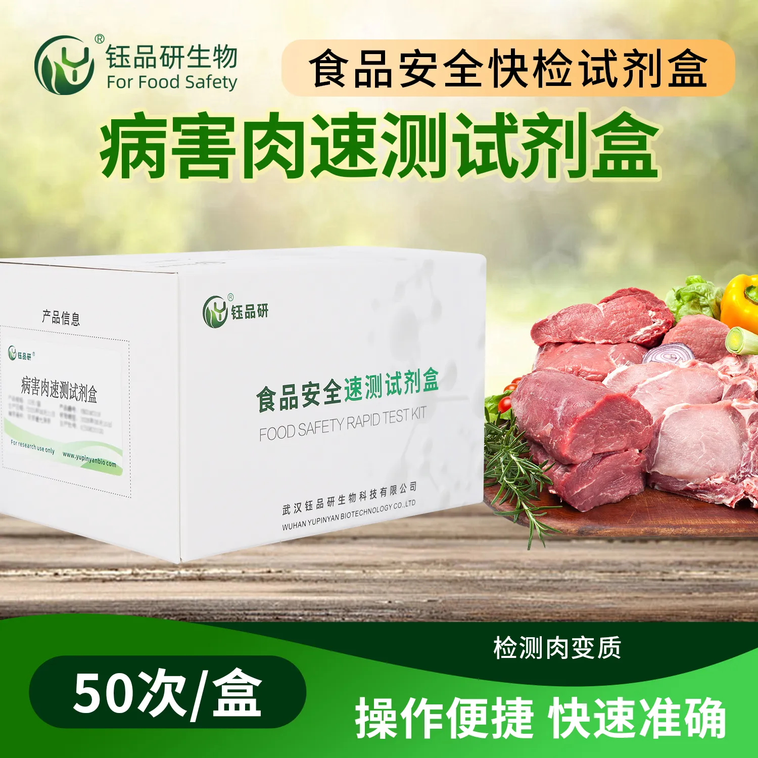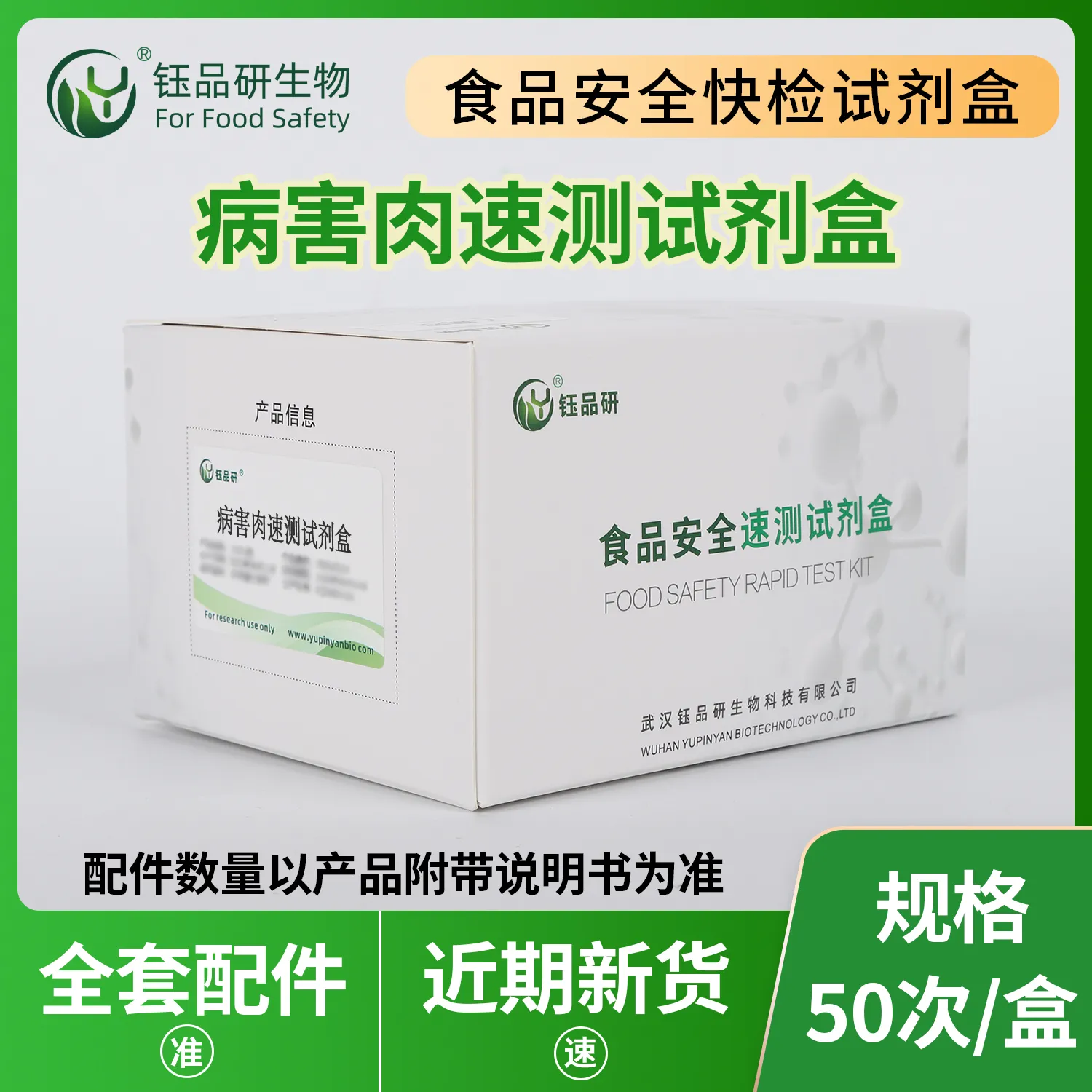 武汉钰品研生物推出病害肉速测试剂盒,基于生物传感器、免疫分析等技术,借特定反应或变化,快速精准检测肉类中细菌、病毒、寄生虫及有害物质。操作简便,无需专业设备,普通人按指南,取适量肉样处理后加检测试剂,短时间内观察颜色变化或仪器读数判断结果。病害肉携带大量病菌,如沙门氏菌等,误食危害极大。适用于肉类加工企业、屠宰场、农贸市场快检及家庭自查。咨询热线 13720286360,守护餐桌肉类安全。...