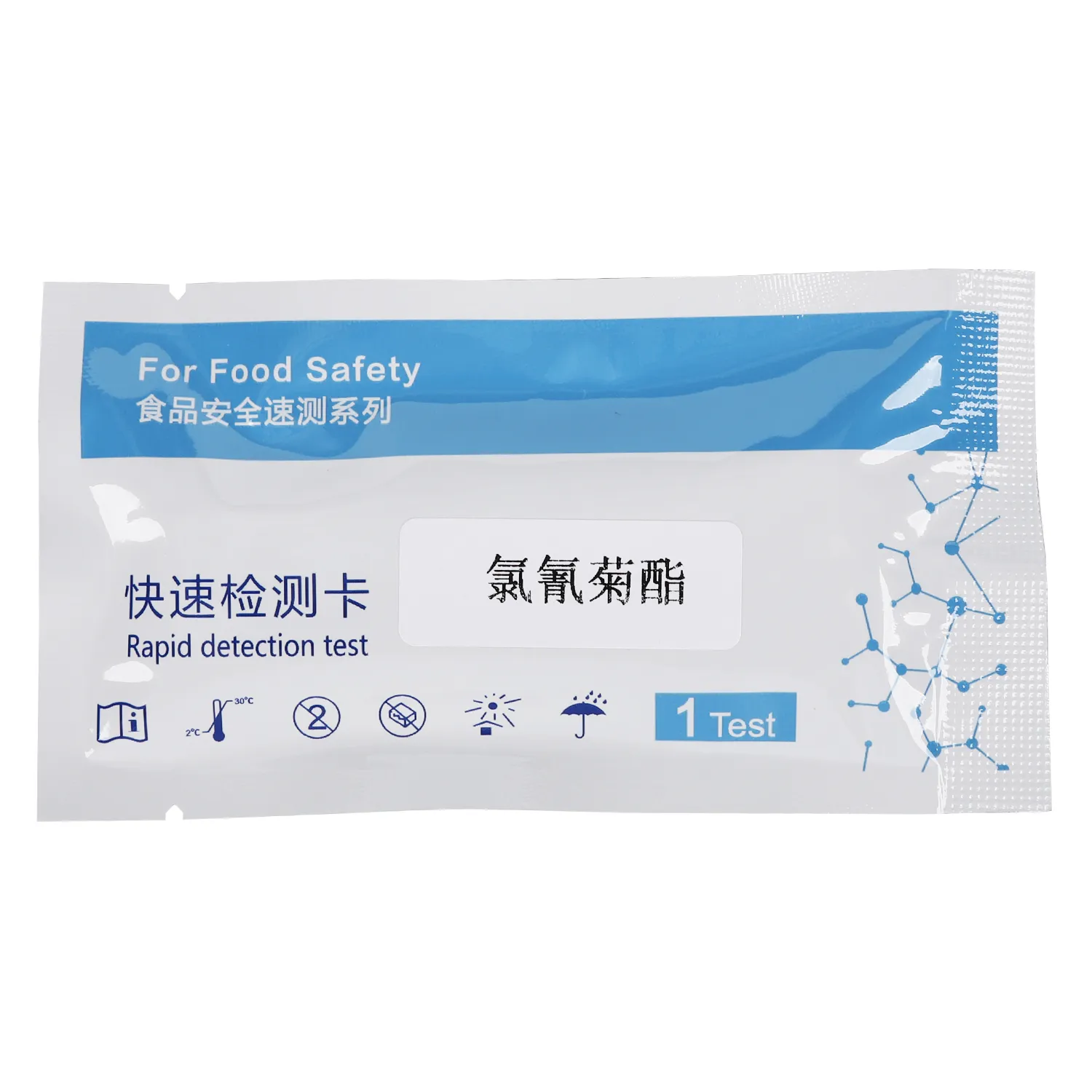 本产品应用竞争抑制胶体金免疫层析的原理制成,用于检测蔬菜、水果中氯氰菊酯农药残留。样本溶液滴入检测卡的加样孔后,样本溶液中的氯氰菊酯与金标抗体相结合,从而阻止金标抗体与纤维素膜上氯氰菊酯偶联物结合,通过C、T线的颜色深浅判断检测结果。
