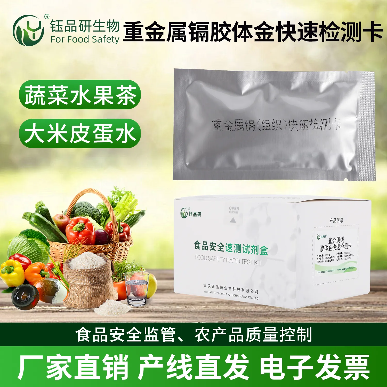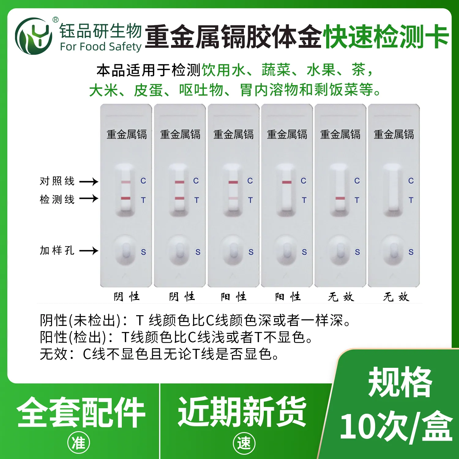 武汉钰品研生物重金属镉胶体金快检卡,基于竞争抑制免疫层析技术,样本中镉离子与胶体金标记抗体结合,抑制其与检测线偶联物结合,借 T 线颜色变化,10 分钟内快速判断残留情况。操作简便,无需专业设备,简单处理样本滴加试剂即可。镉具强毒性,长期摄入会损害肾脏、骨骼,甚至致癌。适用于农产品、水产品、食品加工企业自检、监管抽检等场景。咨询 13720286360,守护饮食安全。...