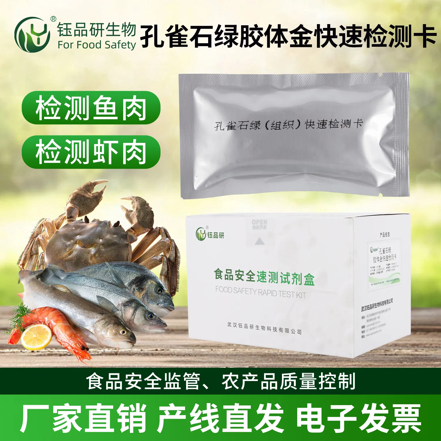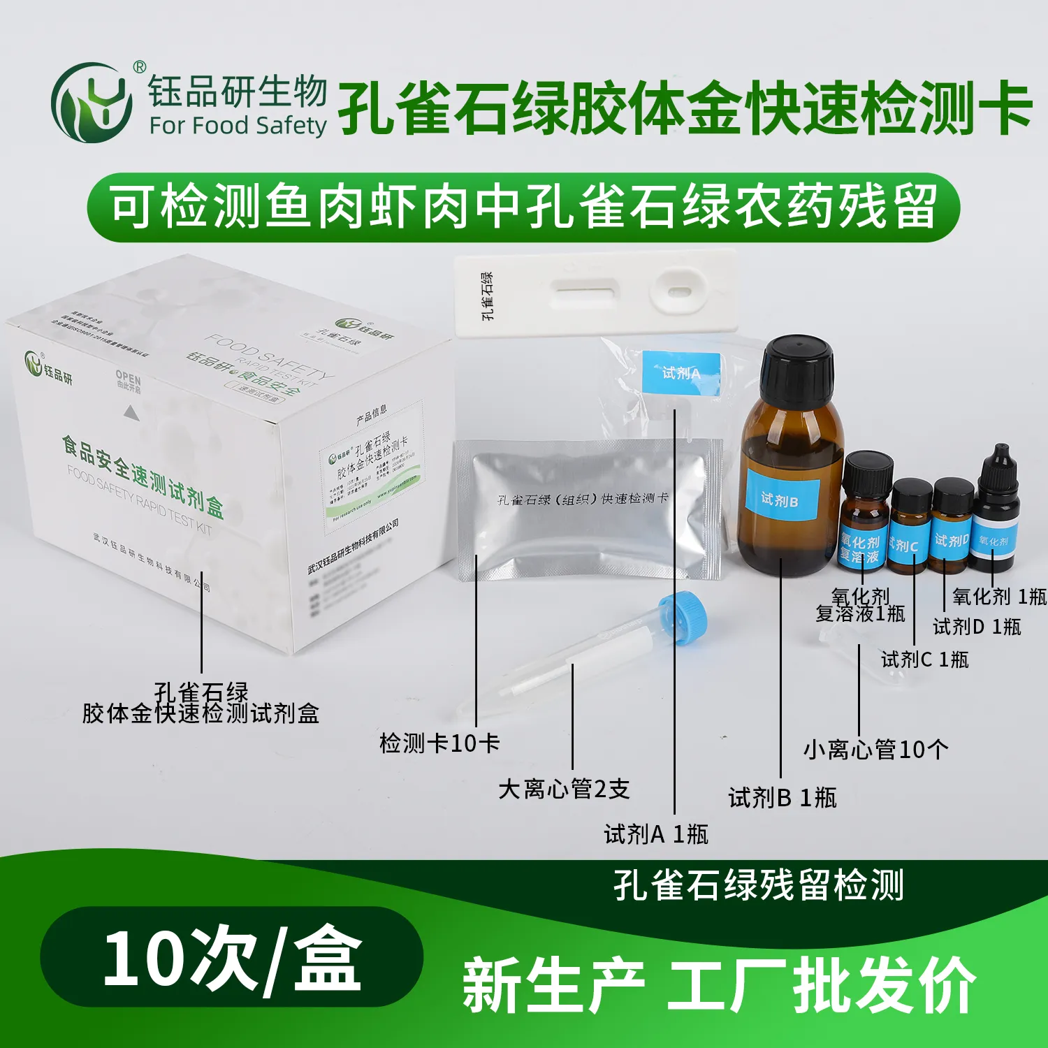 武汉钰品研生物孔雀石绿胶体金快检卡,基于竞争抑制免疫层析技术。样本中的孔雀石绿与胶体金标记的特异性抗体结合,抑制抗体与检测线(T 线)上的孔雀石绿-BSA 偶联物结合,借 T 线颜色变化,10 分钟内快速判断残留情况。操作简便,无需专业设备,简单处理样本后滴加试剂即可。孔雀石绿是有毒三苯甲烷类化学物,曾用于水产杀菌,但其具有高毒性、高残留性和致癌性,我国已明令禁止在水产养殖中使用。适用于水产品企业自检、市场监管抽检及农贸市场快检等场景。咨询 13720286360,守护饮食安全。...