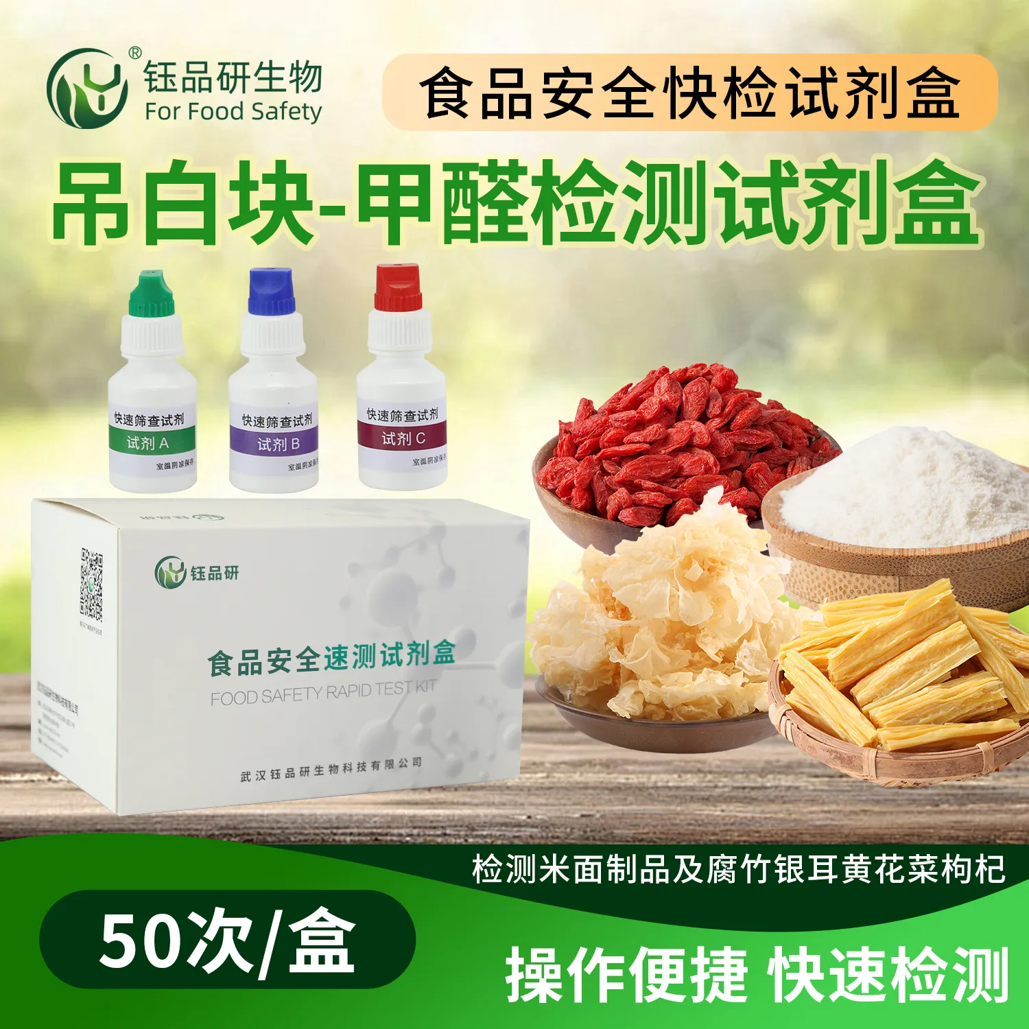 武汉钰品研生物食品中吊白块 - 甲醛速测试剂盒,基于特定化学反应原理,吊白块分解出的甲醛与试剂发生反应,生成特征颜色,依颜色变化 10 分钟内快速判定含量。操作简便,无需专业设备,按说明处理样本、添加试剂即可。吊白块严禁用于食品,其分解产物甲醛严重损害人体呼吸、心血管等系统,有致癌风险。适用于米面制品、豆制品、水发产品等食品企业自检、市场监管抽检、餐饮自查。咨询 13720286360,守护食品消费安全。...
